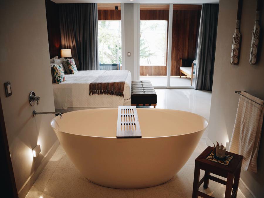O conceito dessa acomodação é que você consiga apreciar a vista de onde o estiver no quarto, seja deitado na cama, na ducha ou na banheira, proporcionando uma experiência única de bem-estar e conforto.