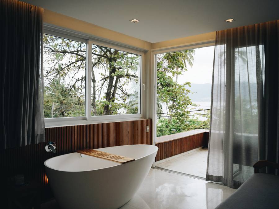 Com vista para o mar e decoração moderna, o quarto é equipado com uma banheira de imersão e uma varanda de tirar o fôlego.