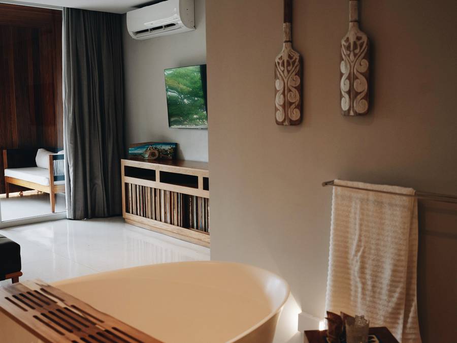 Com uma decoração minimalista, este quarto dispõe de uma ampla varanda com vista para o mar, onde é possível relaxar e contemplar a paisagem. Ela possui uma banheira de imersão, ideal para um banho relaxante ao final do dia.