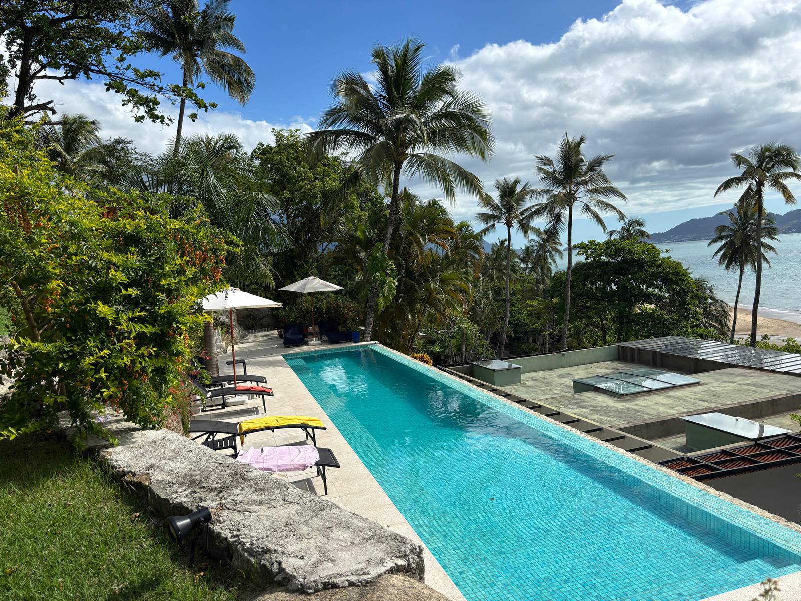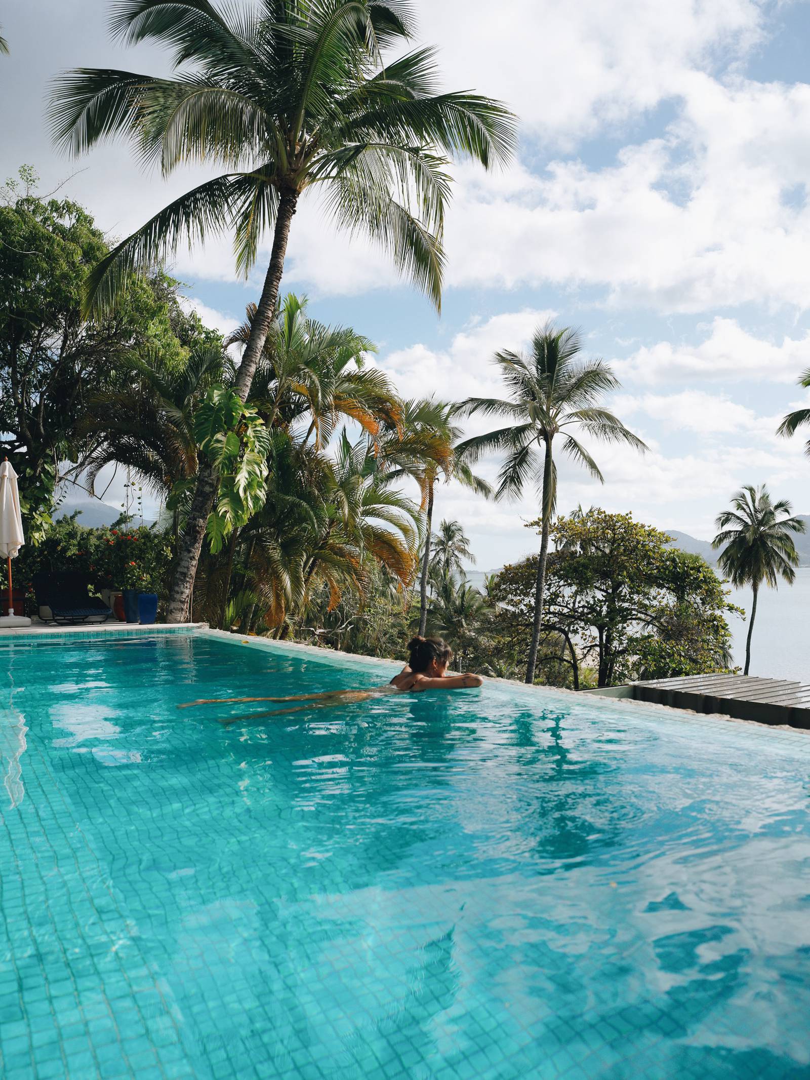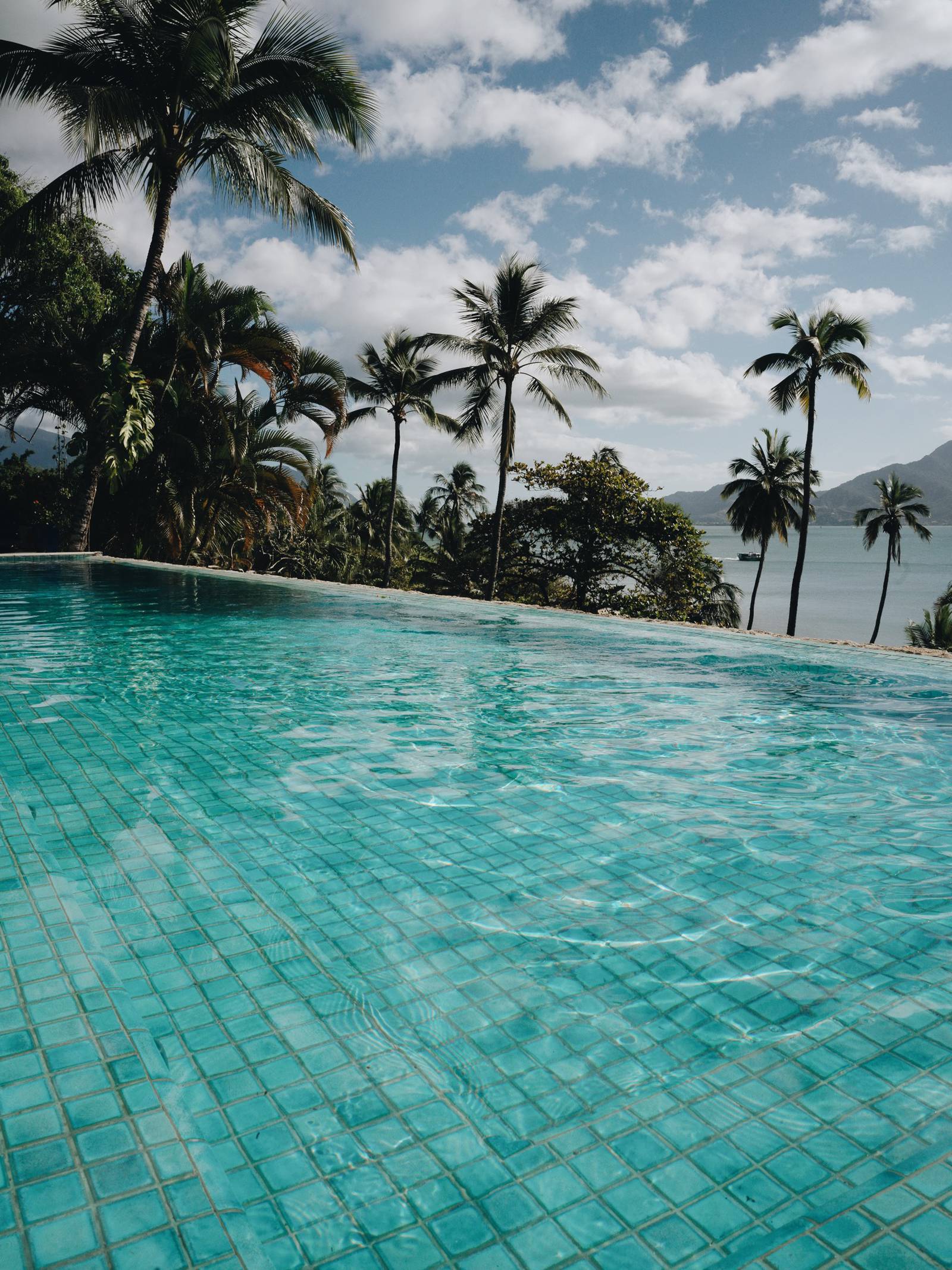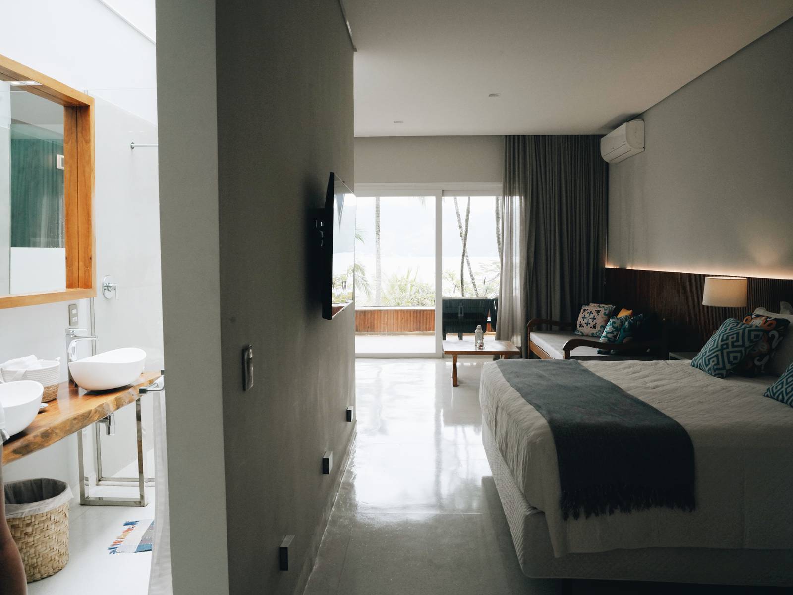 Suítes frente mar com copa equipada, piscina aquecida, café servido na suíte, spa parceiro, serviço de praia e equipe pronta para orientar passeios leves pela ilha.