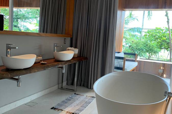 Varanda privativa, vista para o mar e banheira de imersão proporcionam momentos de relaxamento e conforto únicos.