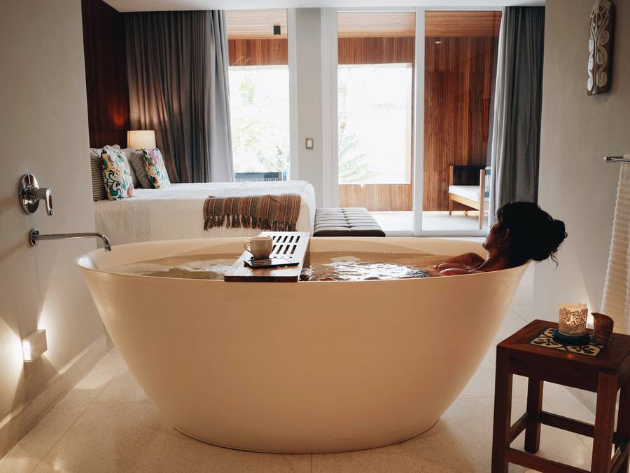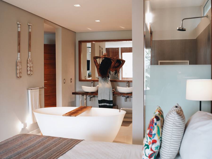 O conceito dessa acomodação é que você consiga apreciar a vista de onde o estiver no quarto, seja deitado na cama, na ducha ou na banheira, proporcionando uma experiência única de bem-estar e conforto.