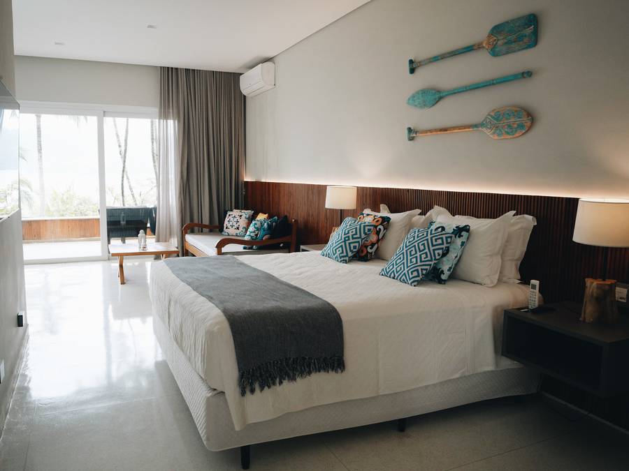 Com uma belíssima vista para o mar, a acomodação é equipada com banheira de imersão, varanda privativa e uma confortável cama king size, além de amenities de banho Natura, máquina de café, frigobar e Wi-Fi.
