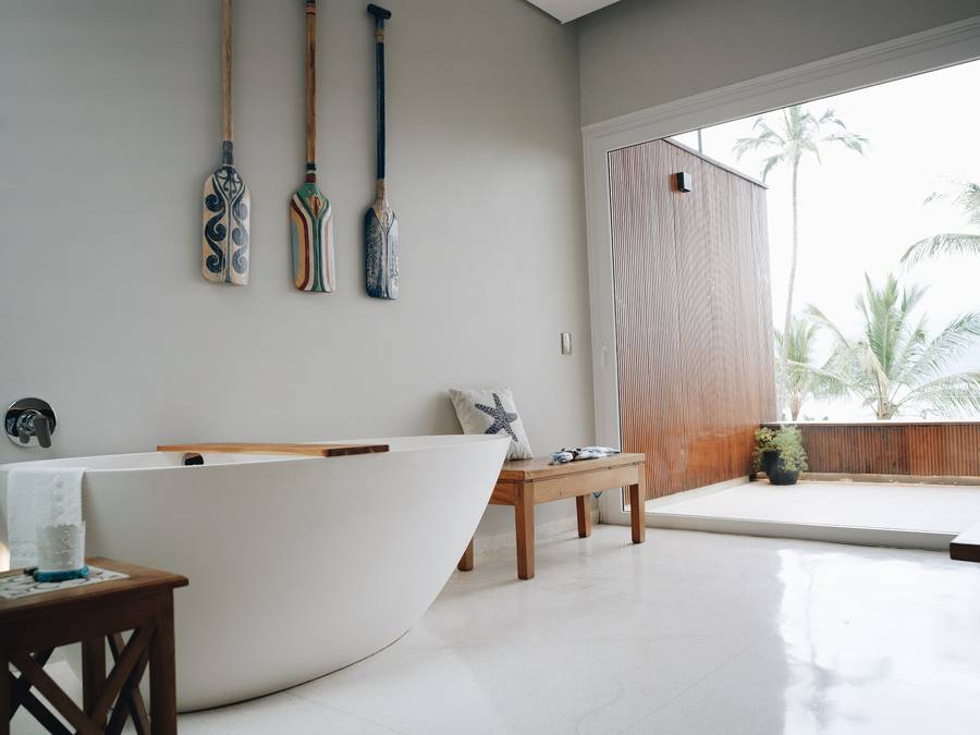 Com vista para o mar e decoração moderna, o quarto é equipado com uma banheira de imersão e uma varanda de tirar o fôlego.