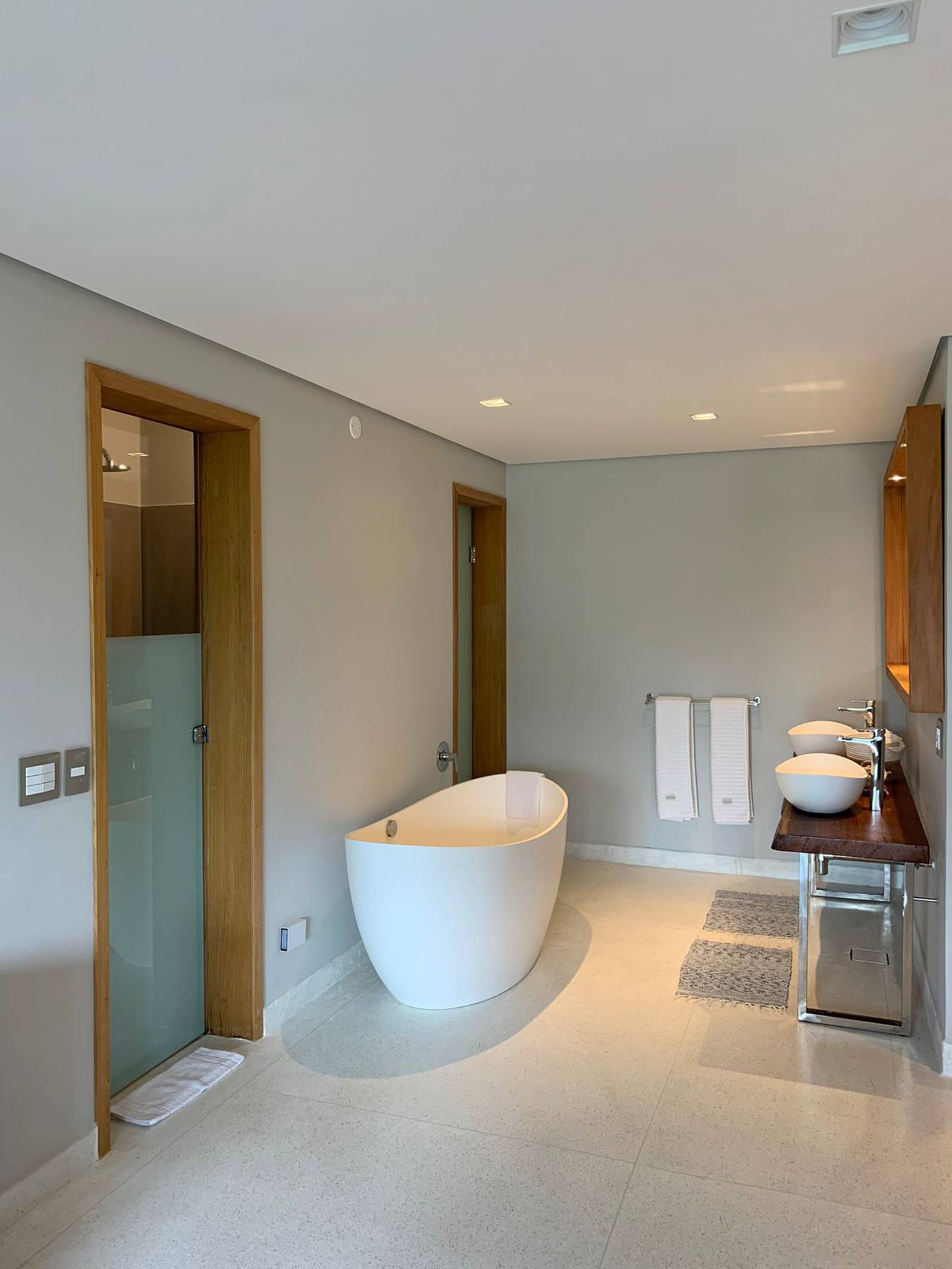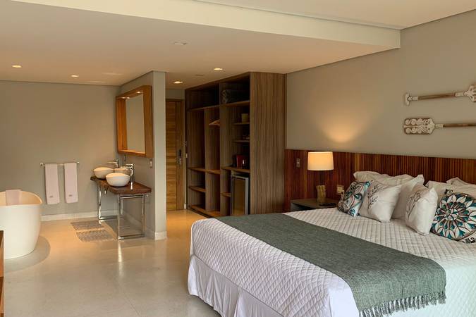 Com vista para o mar e decoração moderna, o quarto é equipado com uma banheira de imersão e uma varanda de tirar o fôlego.